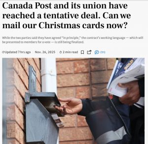 随着圣诞节临近,加拿大邮政服务是否会因劳资纠纷而受阻,一直牵动着全国消费者与企业的神经。根据《多伦多星报》的报道,加拿大邮政(Canada Post)日前与加拿大邮政工人工会(Canadian Union of Postal Workers,CUPW)终于宣布,双方就新的集体协议达成“原则性协议”(agreement in principle),使此前困扰全国的邮政中断风险暂时解除。