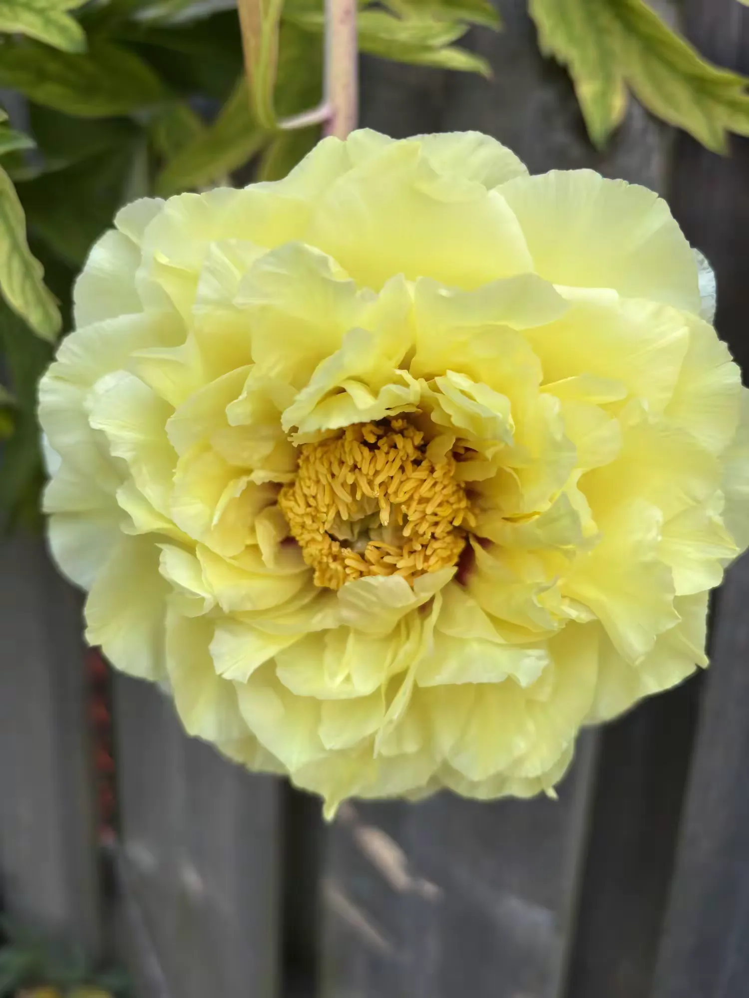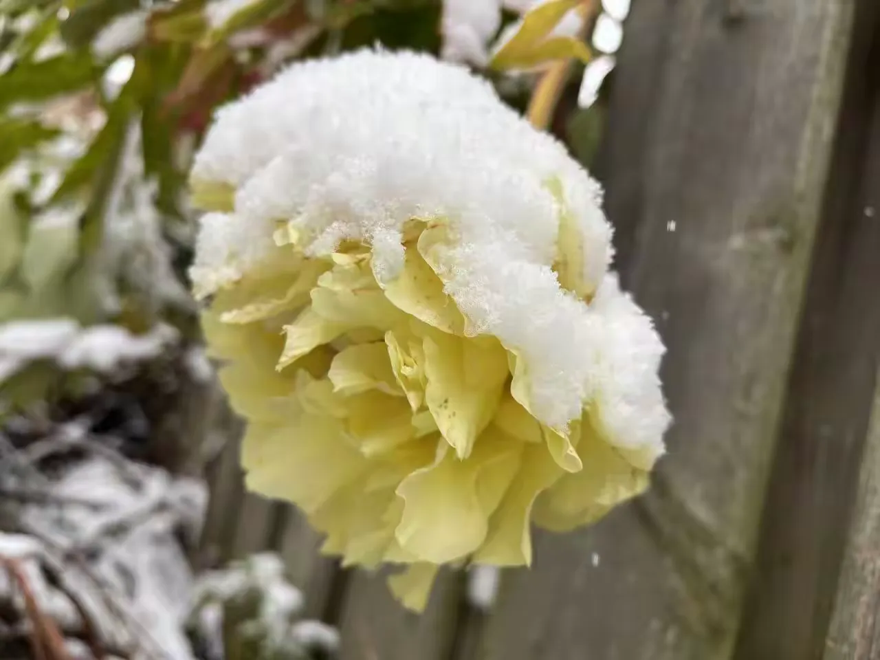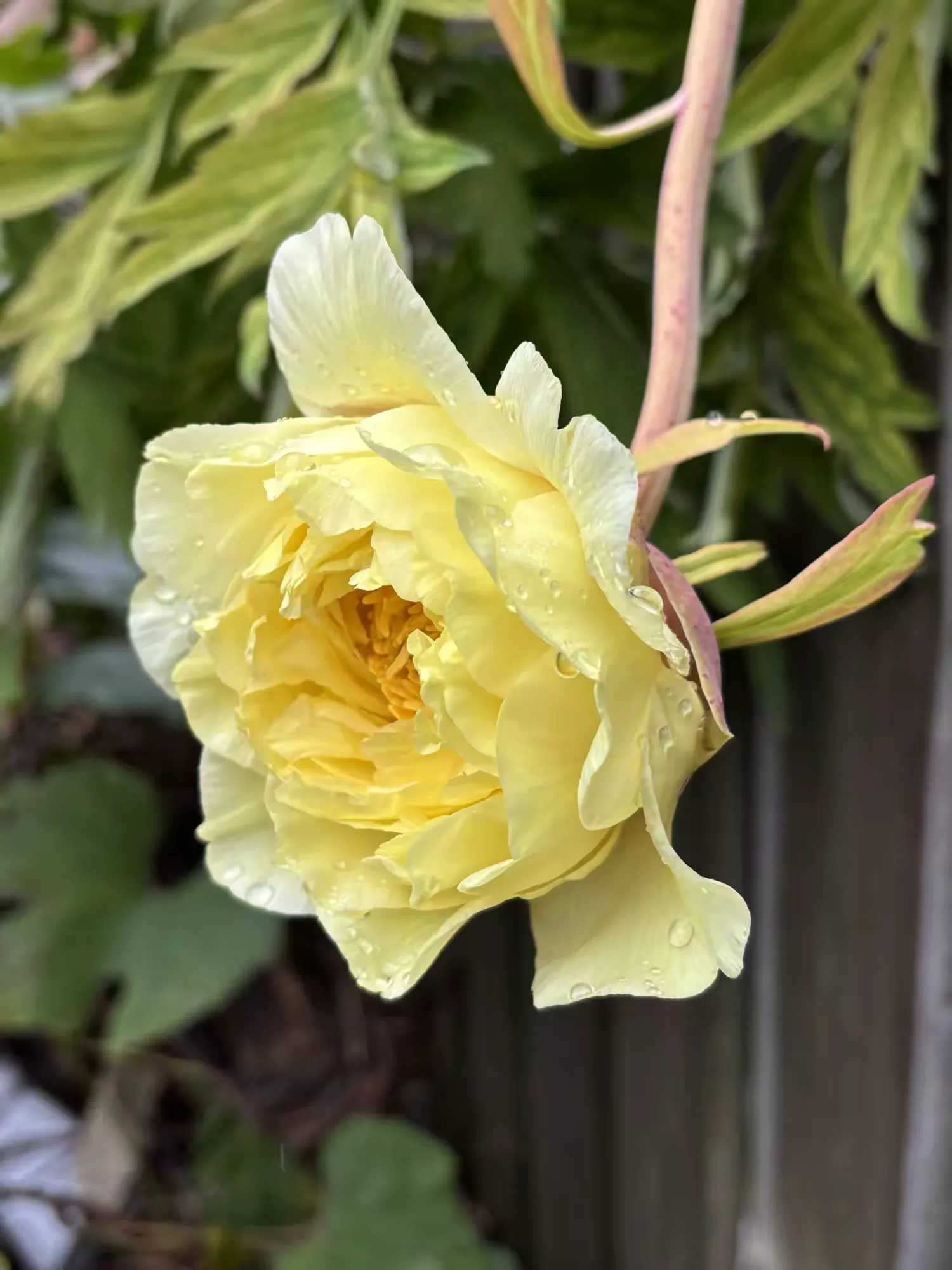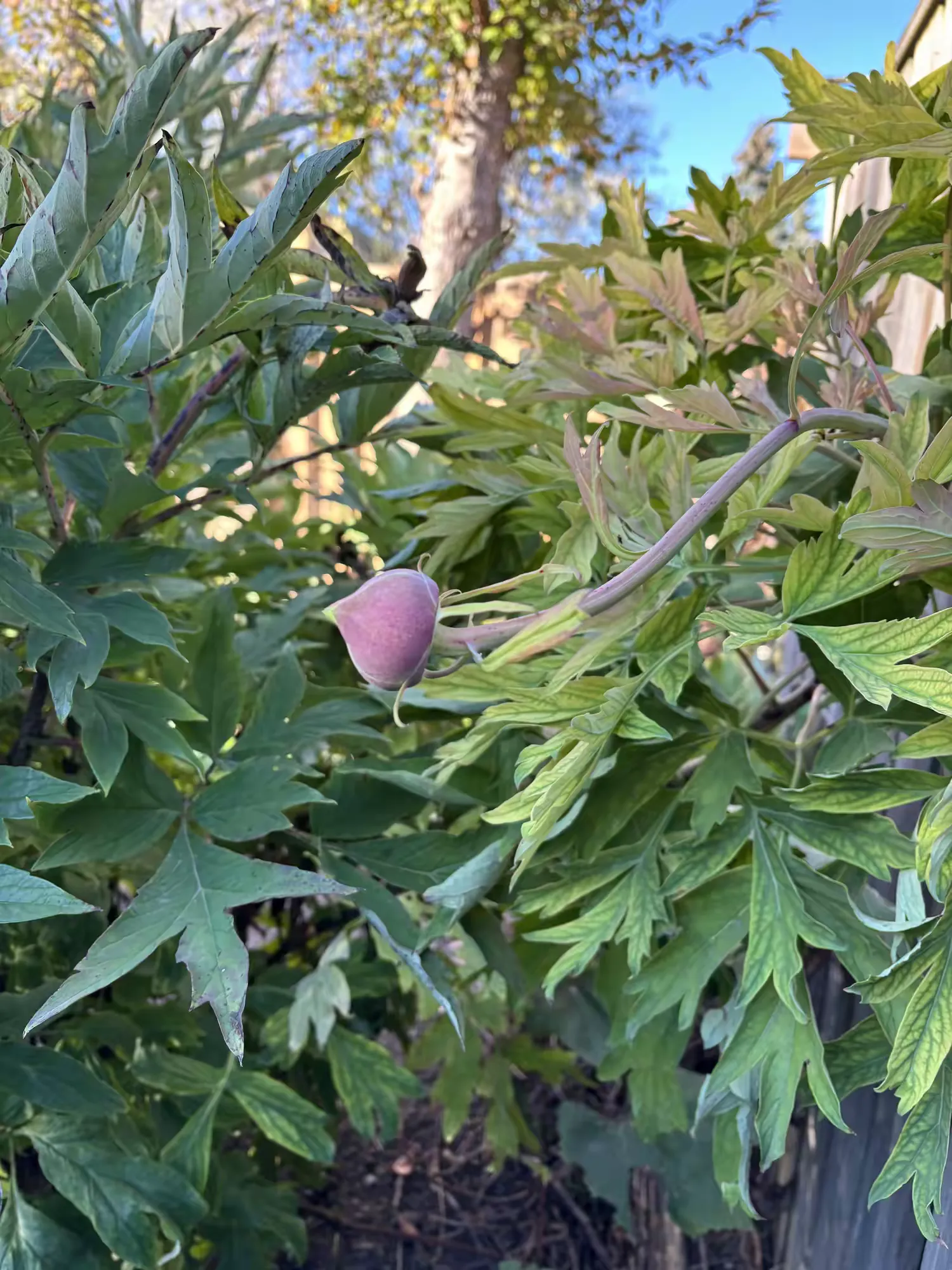 因为今年有闰六月,导致节令后延。感恩节前后,气温比往常提升。在我家后花园里,从朋友处割爱移栽过来,已有十年的海黄牡丹,在初春已经芳菲一阵之后,竟然再吐芳华。在这个感恩节前后,静静地,让人眼前一花,一个青涩细巧的花苞,显现在面前。