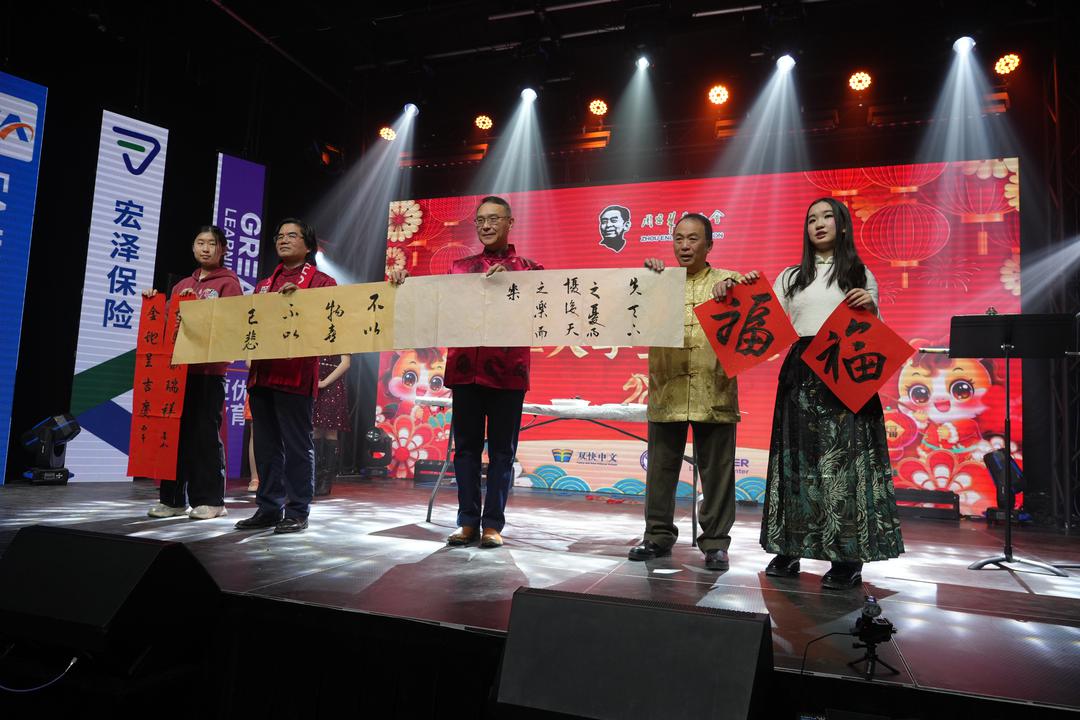 全场由22位新生代中文主持人接力主持,五大板块串联推进,共呈现31个节目,涵盖合唱、朗诵、戏剧、相声、绕口令、舞蹈、功夫与现场书法等多元形式,集中展示了加拿大学生中文学习成果与中华文化魅力。