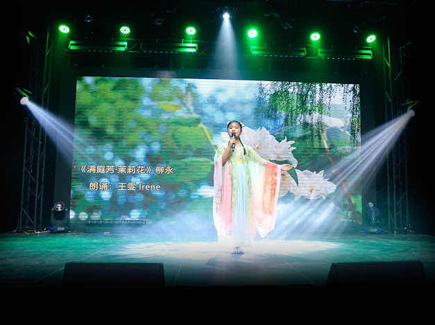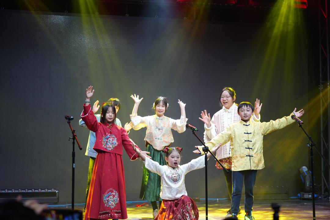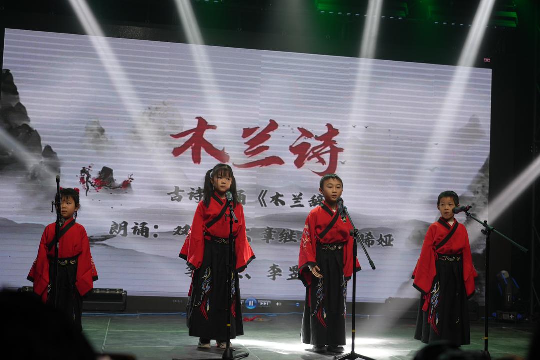 “主持人挑战绕口令”让全体主持人同台练功,口齿与台风一并亮相;《将进酒》朗诵豪迈昂扬;“中国功夫秀”拳风猎猎、气势十足;《满庭芳·茉莉花》清雅婉转;“古诗朗诵接力”由20余名学生轮流完成,最小演员仅两岁,群声汇聚、书声如潮,为整台晚会收束出昂扬的文化合唱。