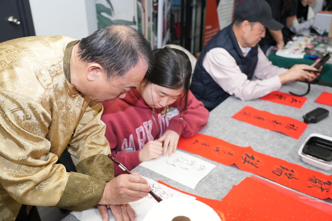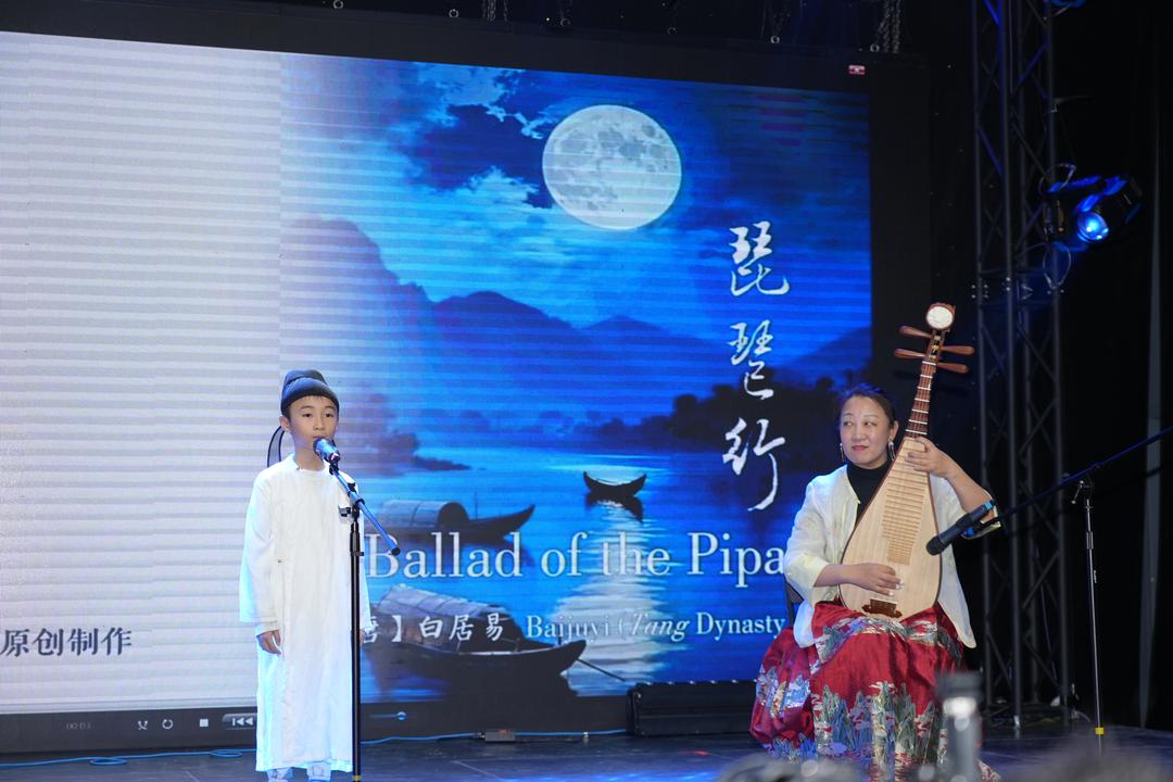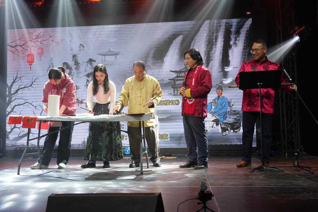 《琵琶行》配琵琶伴奏(著名琵琶演奏家杨小磊伴奏),诗乐相映;《成语拜新年》以歌传情,年味扑面;《千年之约》清亮抒情;舞蹈《酒妹》以形写意;合诵《木兰辞》铿锵有力;崔冰辉议员以京剧慢板演绎《将进酒》,传统韵味十足;燕飞会长配乐朗诵《岳阳楼记》,并与书法家李荣宗及其高足谢晋如、谢雍如现场书写同台呈现,文气与墨香交织成章。