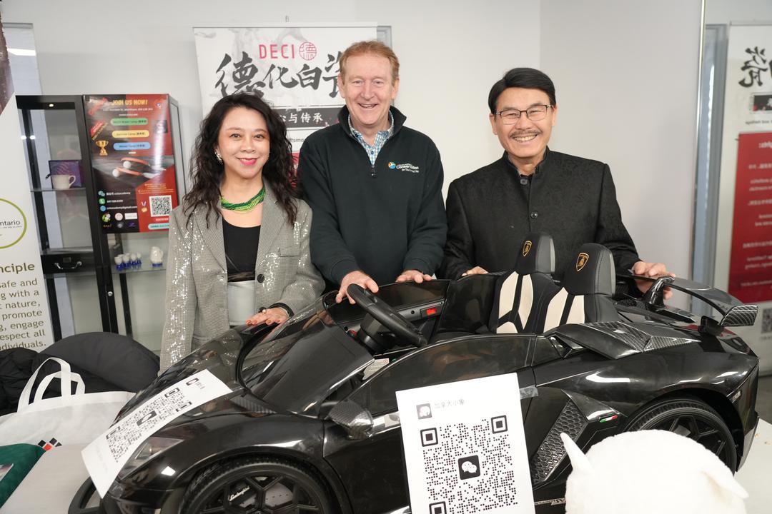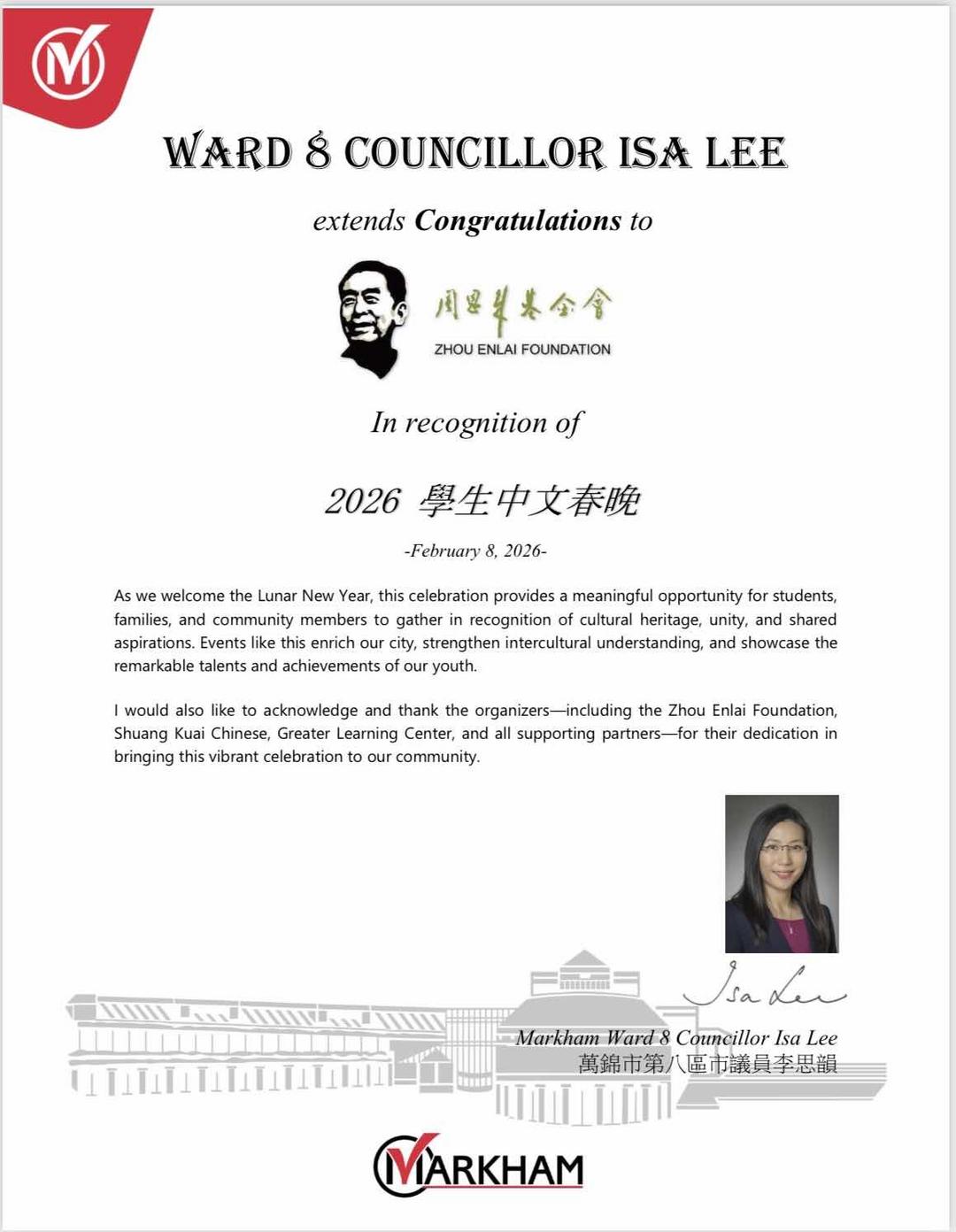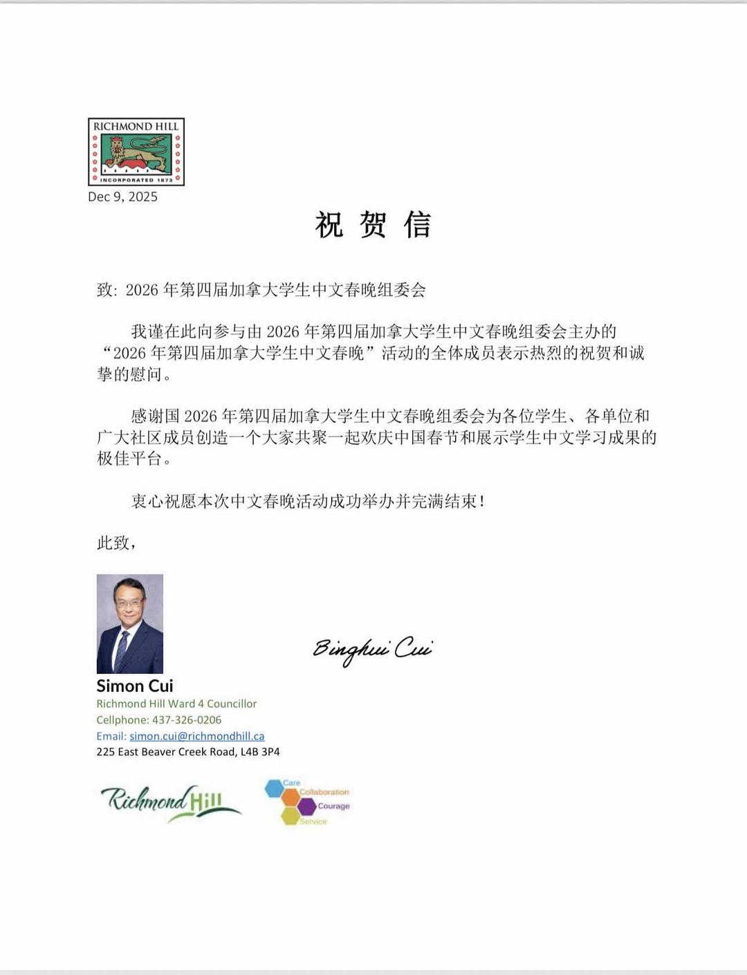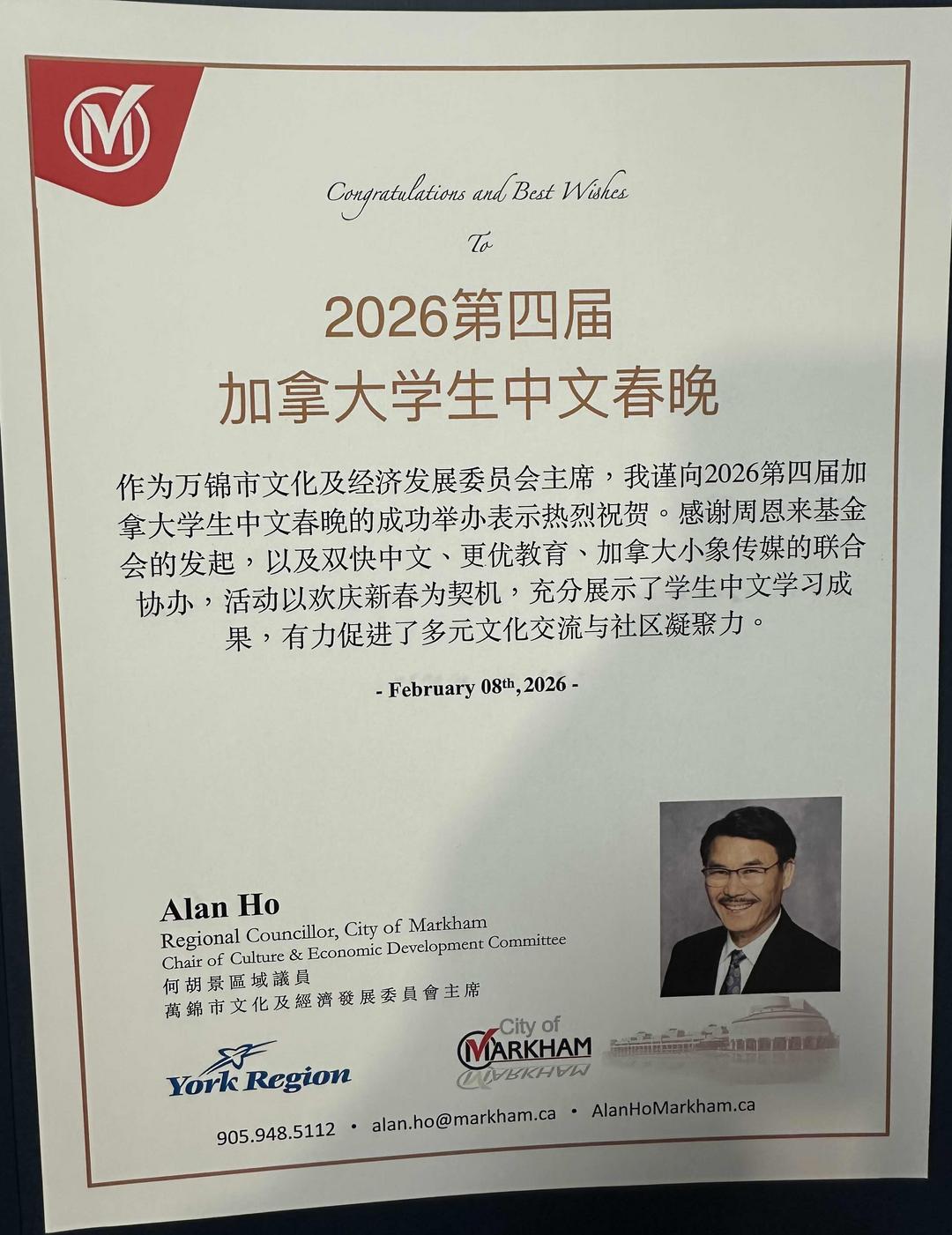 万锦市议员何胡景、万锦市议员李思韵、列治文山市议员崔冰辉向晚会总策划、更优双快中文校长罗阳富赠送贺信