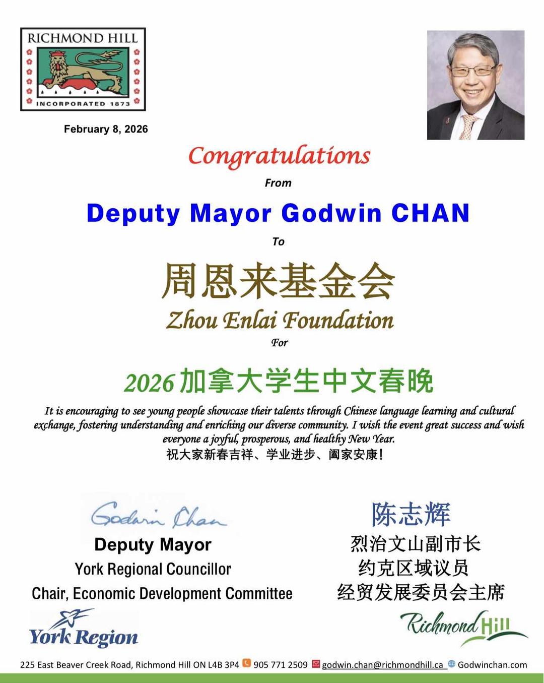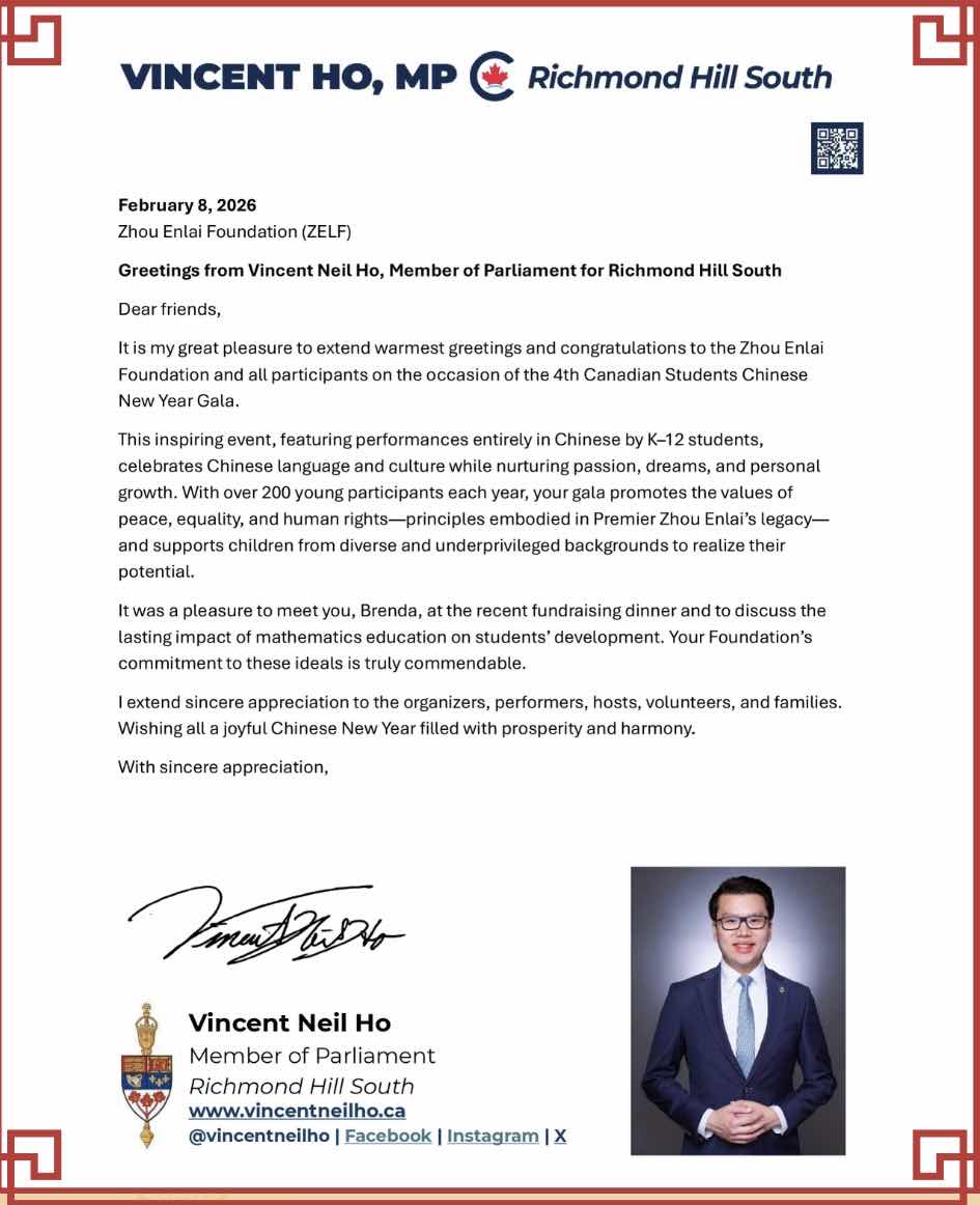 中国驻多伦多总领馆、加拿大国会议员叶嘉丽、联邦保守党国会议员 Vincent Ho、列治文山市副市长陈志辉等发来贺信,预祝学生中文春晚圆满成功。