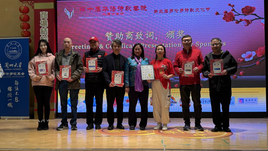 晚会期间,主办方特别邀请协办单位、赞助商、表演团队负责人登台致辞、并为他们颁发感谢状。冠名赞助商【兰州大学多伦多校友会】会长穆诗今与代表Grace卿华、黄金赞助商罗氏律师事务所、上明地产程炯、RealtyAI、Costco、逍遥谷等代表先后发言,表达对华语诗歌春晚的支持与祝愿,各大赞助商一起登台合影,共襄盛举。