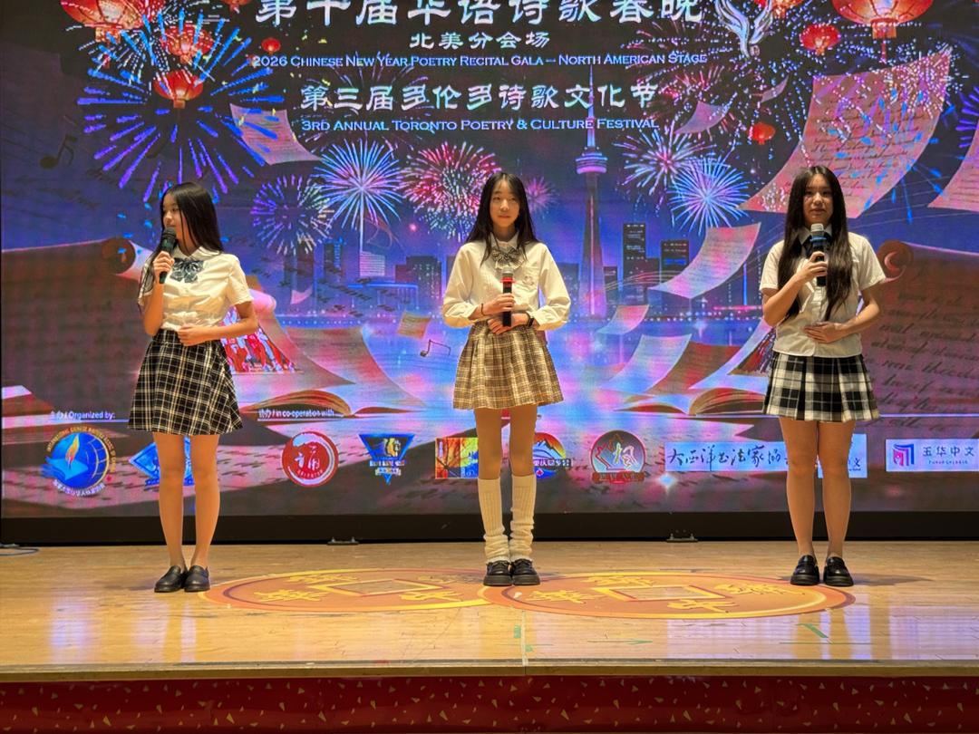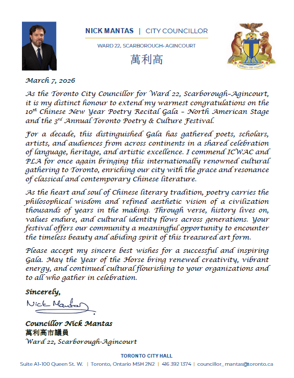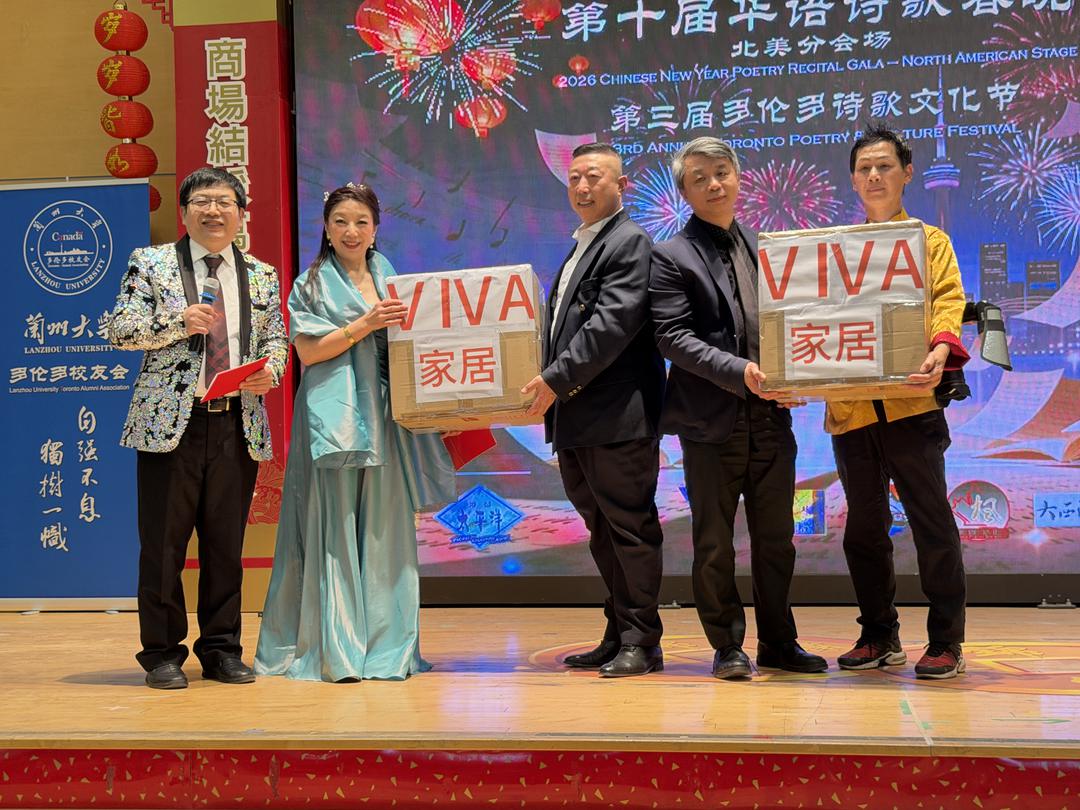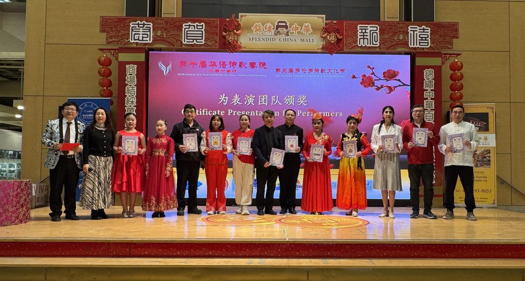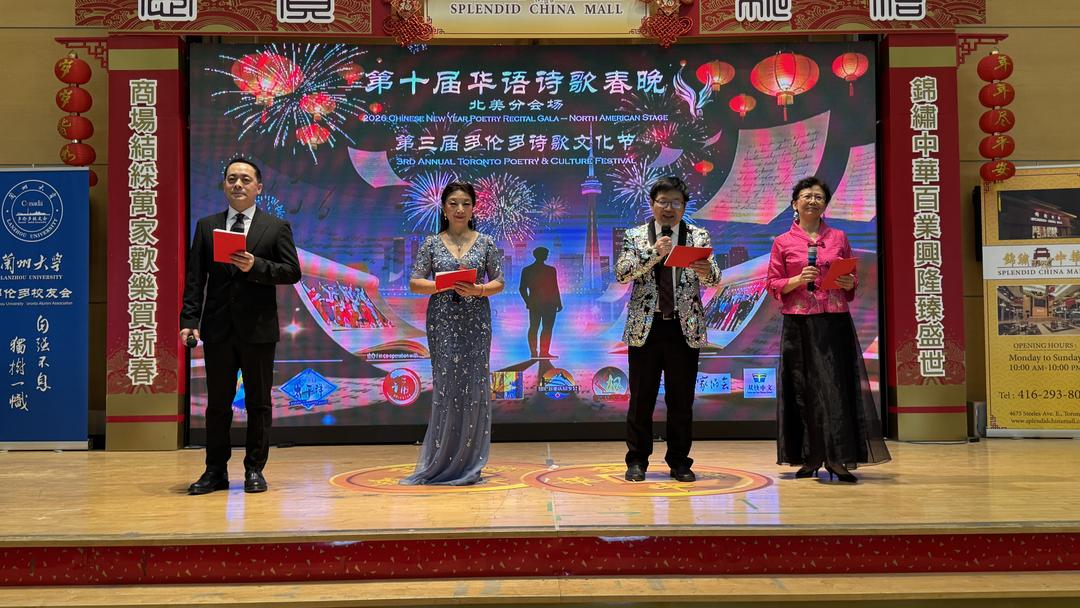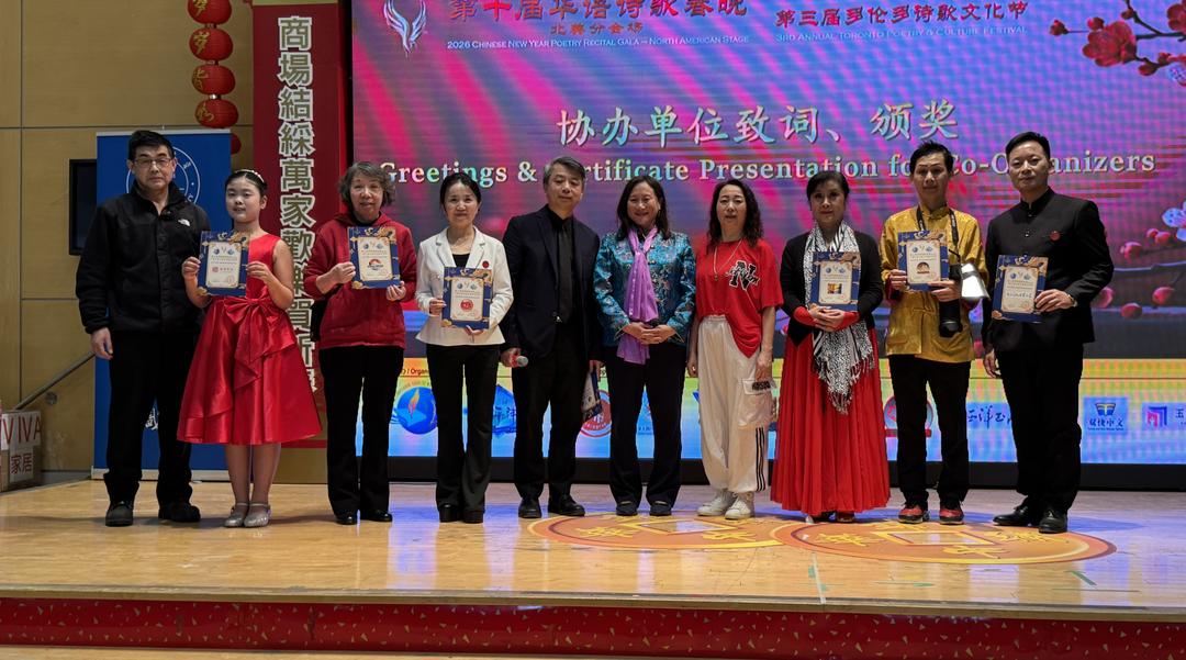 2026年3月7日下午1点至5点,多伦多锦绣中华商场大舞台华灯璀璨,诗意流淌。全球瞩目的第十届华语诗歌春晚——北美分会场在此盛大举行。这是华语诗歌春晚首次迎来十周年庆典,也是这一文化盛事第三次登陆北美大地。本次活动由【加拿大国际华人作家协会】与【诗情太平洋国际文学社】联合主办,【加拿大朗诵艺术团】、【北美华人文学社】、【枫林诗社】、【多伦多重庆同乡会】、【加拿大枫叶交流文化中心】、【朗读者 – 加国精英】、【双快中文】、【玉华中文】、【大西洋书法家协会】等多家文化机构协办,以“人,诗意的栖居”为主题,汇聚诗歌、音乐、舞蹈、书法、太极等多元艺术形式,为现场观众献上了一场精彩绝伦的文化盛宴。