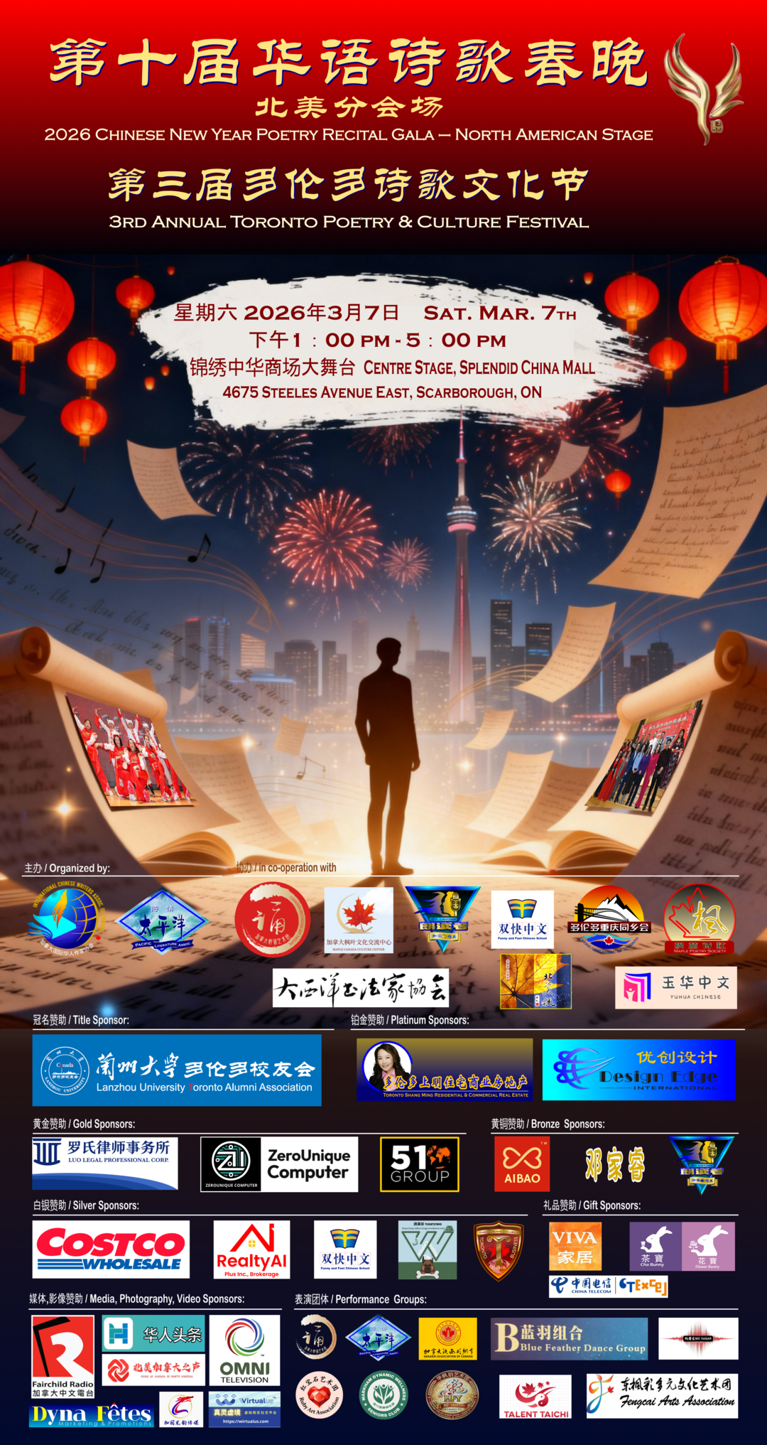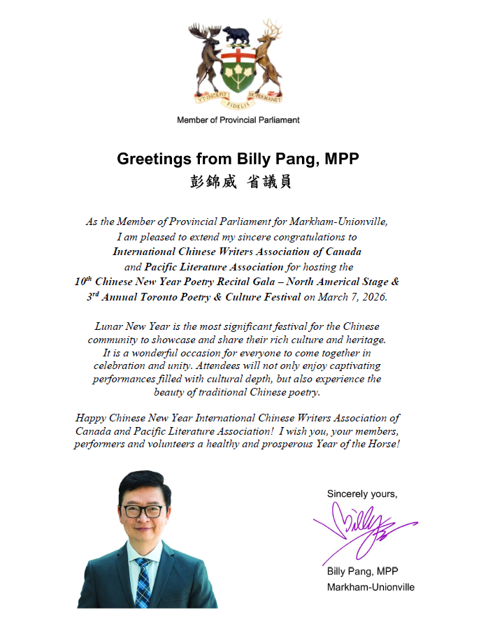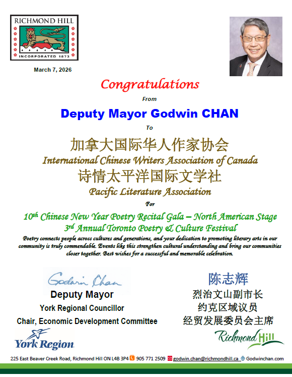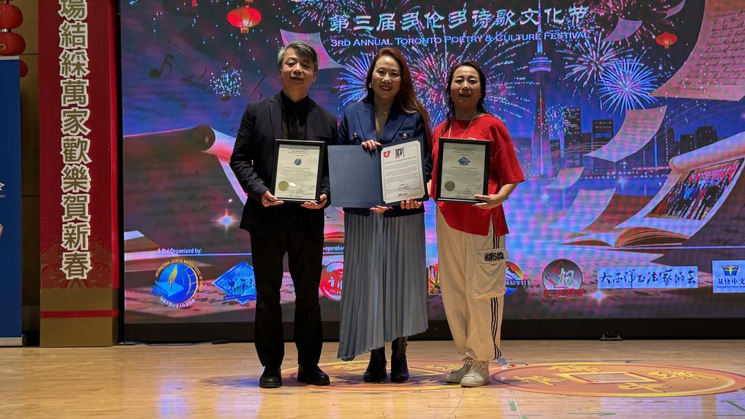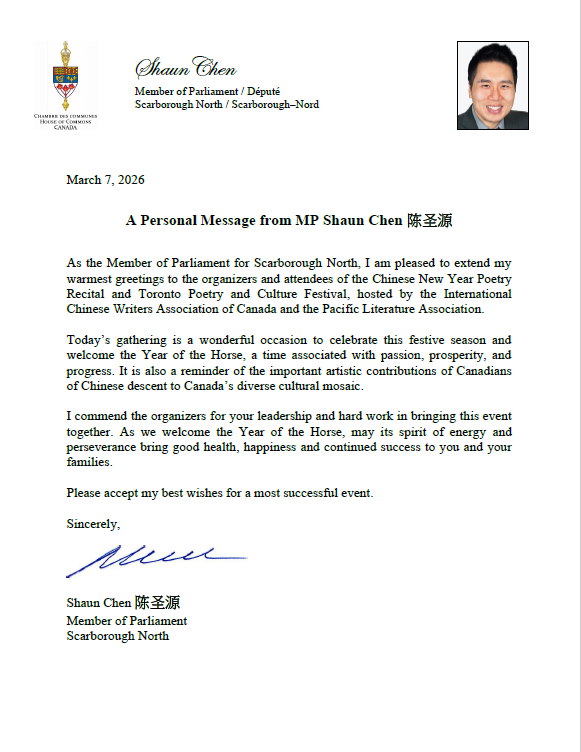 2026年3月7日下午1点至5点,多伦多锦绣中华商场大舞台华灯璀璨,诗意流淌。全球瞩目的第十届华语诗歌春晚——北美分会场在此盛大举行。这是华语诗歌春晚首次迎来十周年庆典,也是这一文化盛事第三次登陆北美大地。本次活动由【加拿大国际华人作家协会】与【诗情太平洋国际文学社】联合主办,【加拿大朗诵艺术团】、【北美华人文学社】、【枫林诗社】、【多伦多重庆同乡会】、【加拿大枫叶交流文化中心】、【朗读者 – 加国精英】、【双快中文】、【玉华中文】、【大西洋书法家协会】等多家文化机构协办,以“人,诗意的栖居”为主题,汇聚诗歌、音乐、舞蹈、书法、太极等多元艺术形式,为现场观众献上了一场精彩绝伦的文化盛宴。