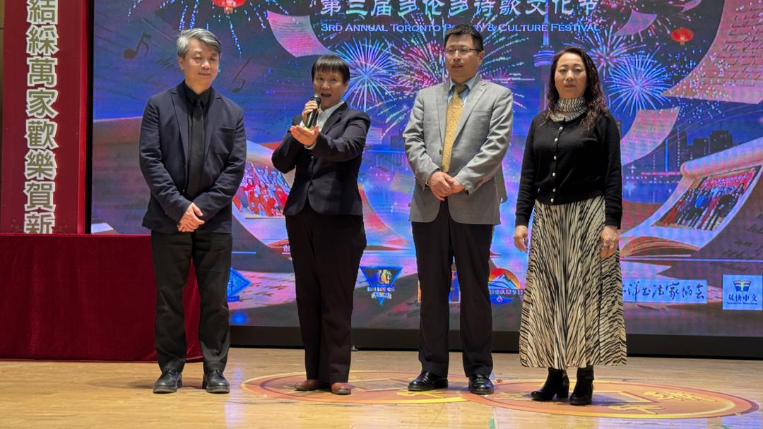 主持人安文生、May、韩松、Mandy登台,热情欢迎莅临现场的各界嘉宾。加拿大国会议员叶嘉丽(MP Jean Yip)、国会议员何諾軒(MP Vincent Ho)亲临现场并致辞,高度评价华语诗歌春晚对促进多元文化交流、弘扬中华优秀传统文化的卓越贡献。约克区议员何胡景(Alan Ho)、万锦市议员杨绮清(Amanda Collucci,代表万锦市长)、刘肇麟(Ritch Lau)也先后登台,送上诚挚祝福。未能亲临现场的国会议员陈圣源Shaun Chen、安大略省议员彭锦威Billy Pang, 列治文山市副市长陈志辉Godwin Chan,多伦多市议员万利高Nick Mantas, 列治文山市议员崔冰辉Simon Cui等发来热情贺信,祝愿晚会圆满成功。 社区方面,【加拿大华人同乡会联合总会】第九届执行主席,现任会长黄岚,共同主席、齐鲁同乡会会长颜俊也亲临现场致词并送上热烈祝贺。