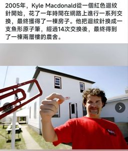 2005年,加拿大青年凯尔·麦克唐纳(Kyle MacDonald)通过16次物品置换,最终用一个红色曲别针换到了一栋别墅的居住权,这一事件让以物换物在全球名声大噪。