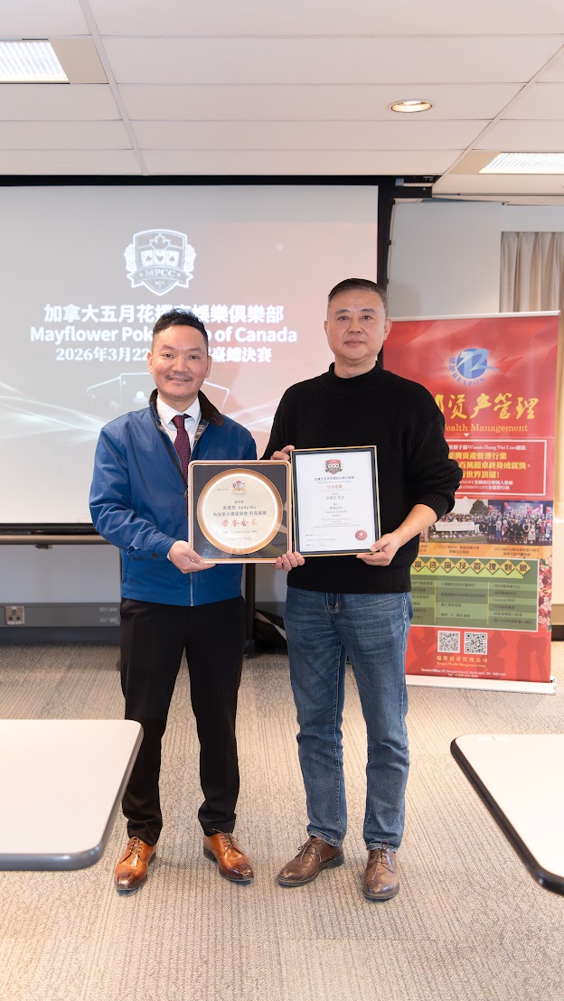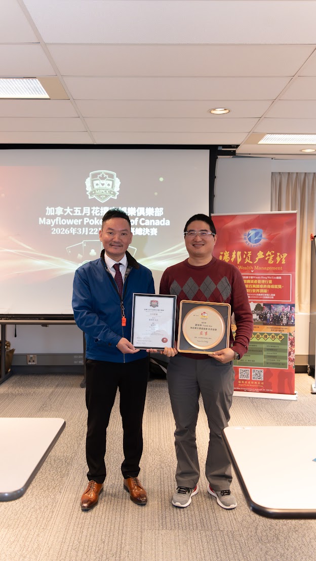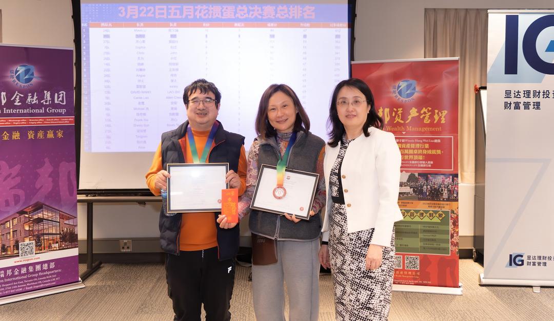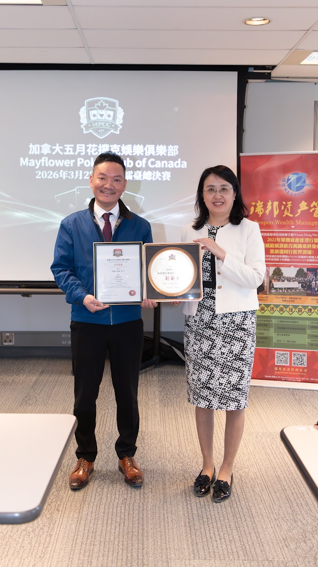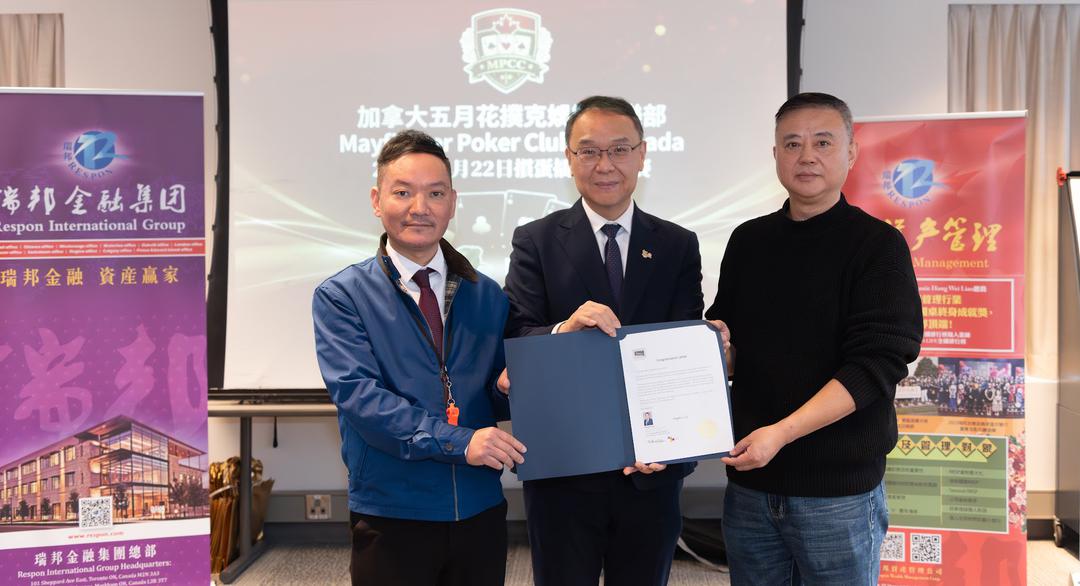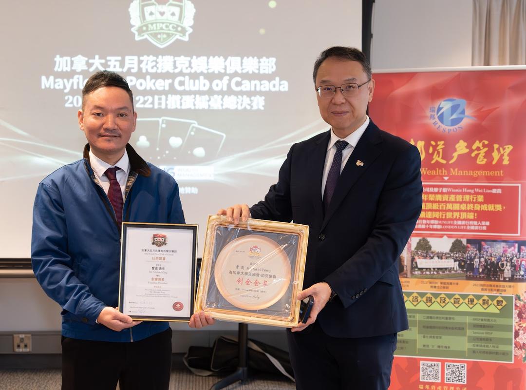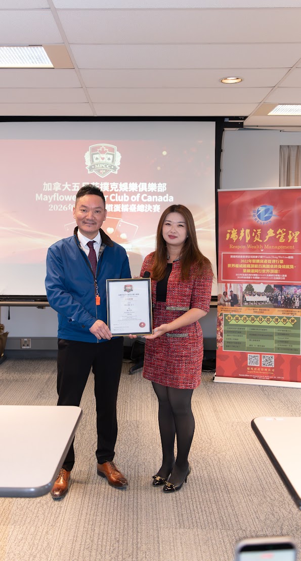 五月花扑克娱乐俱乐部会长曾进和荣誉会长Andy Wu 接受烈治文山市议员 Simon Cui给颁发贺信