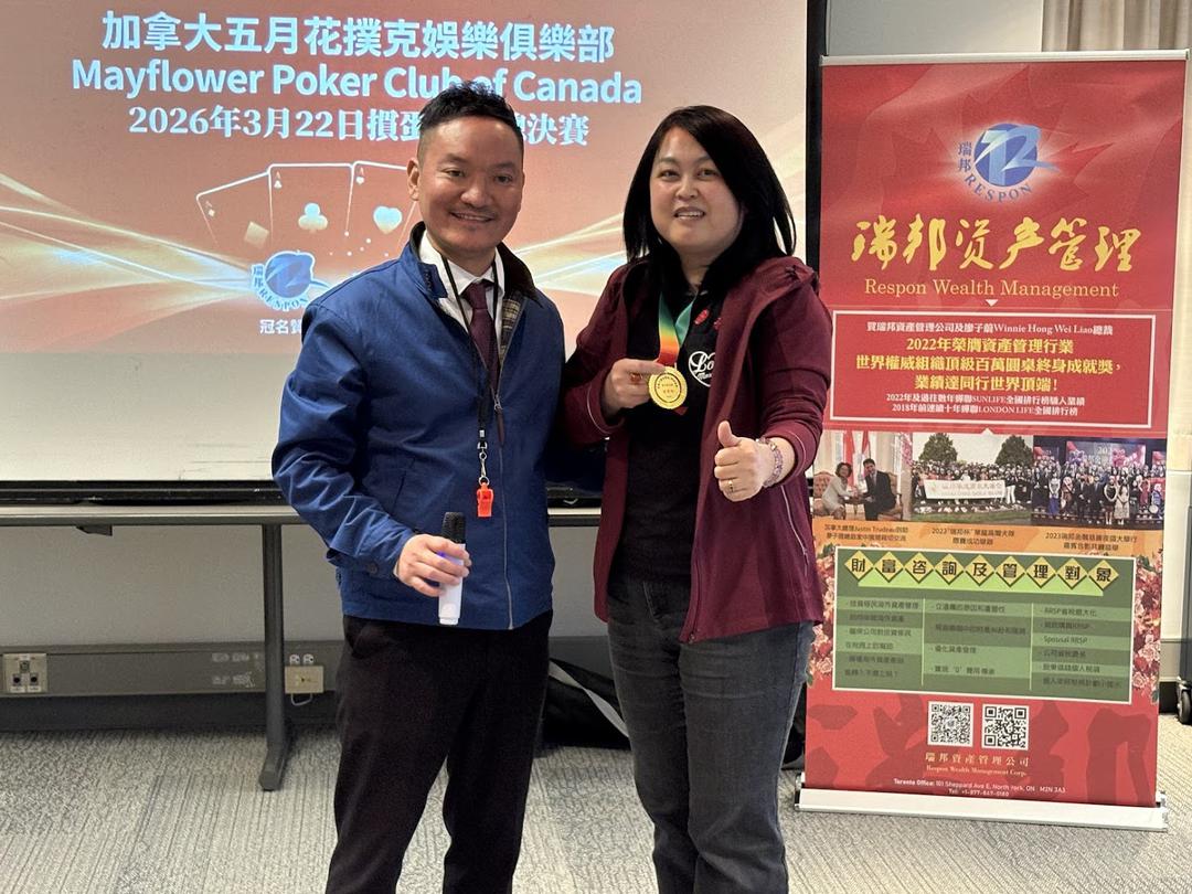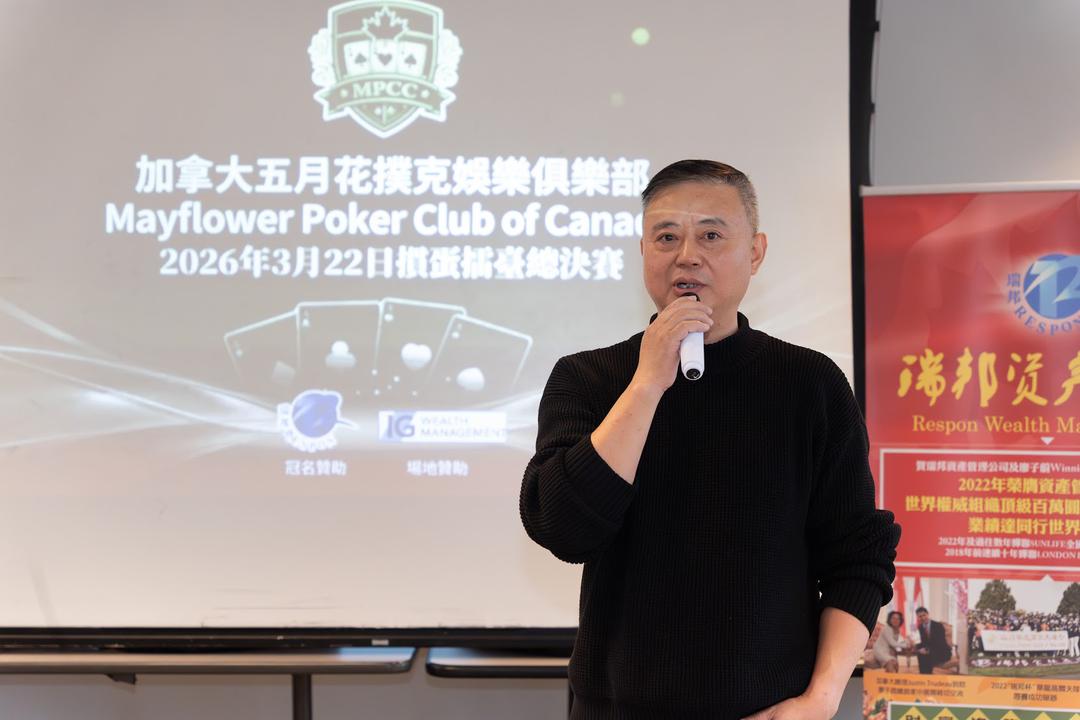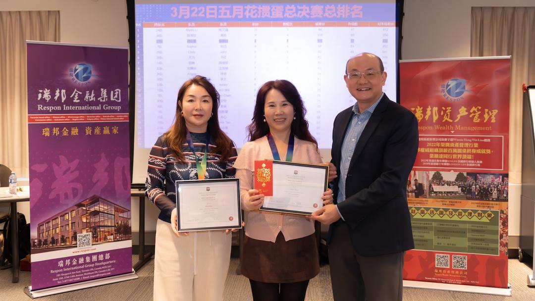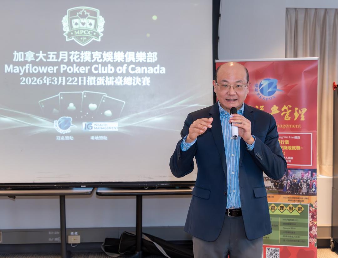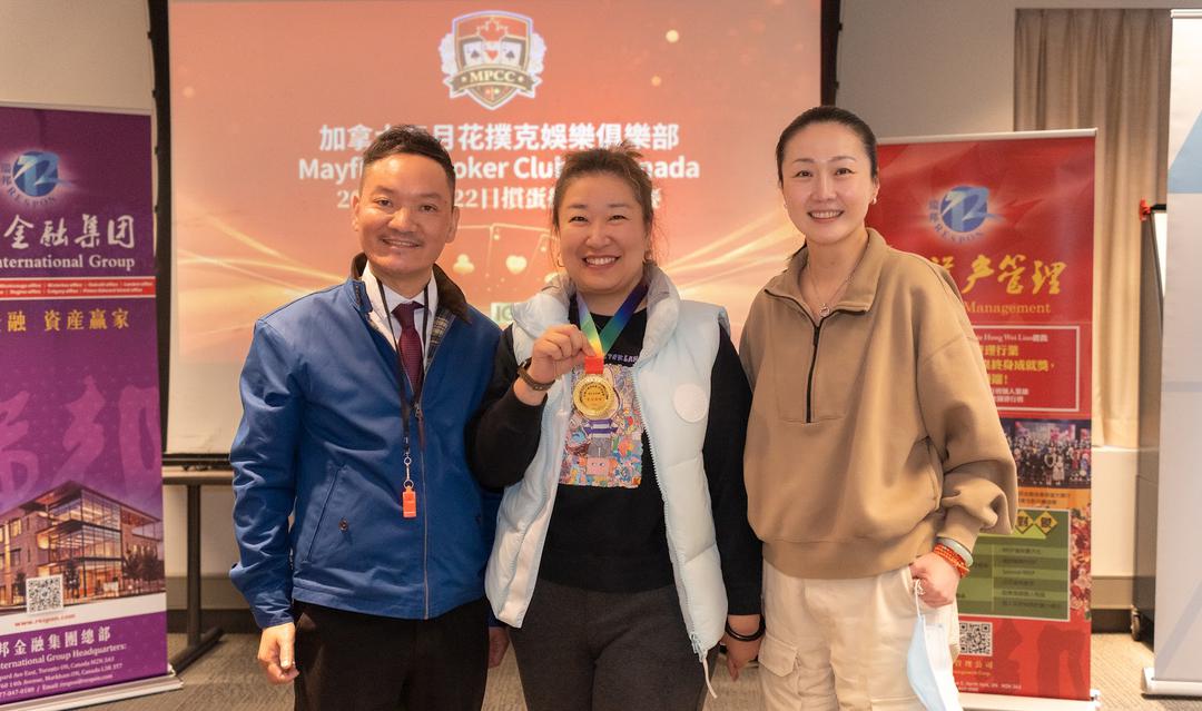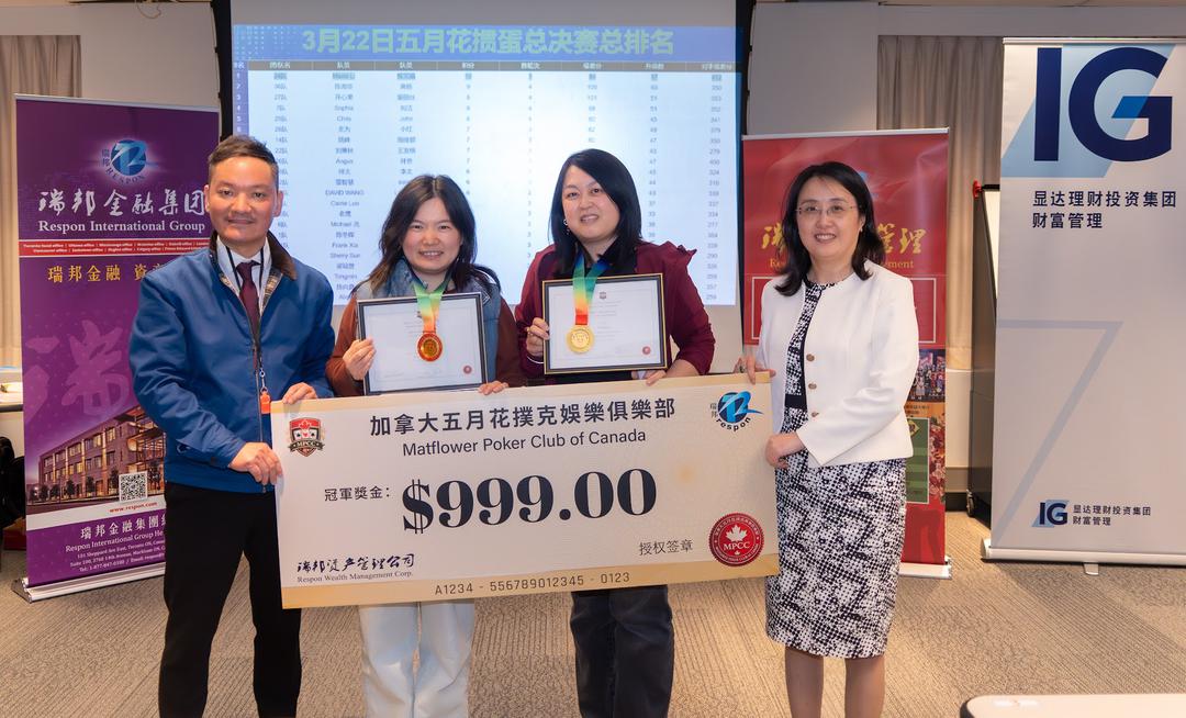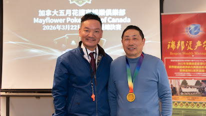 五月花扑克娱乐俱乐部会长曾进和荣誉会长Andy Wu 接受烈治文山市议员 Simon Cui给颁发贺信
